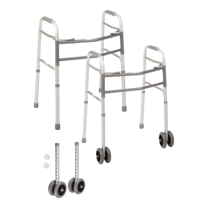 To minimize discomfort during use, the Days Bariatric Walker uses contoured hand grips that comfortably fit into the hand. The walker features rubber-like, polyurethane blend tips for stable support and is available with or without double 5” wheels. The non-wheeled walker option is equipped with convenient glide caps on the legs to prevent slipping and potential falls on all surfaces.